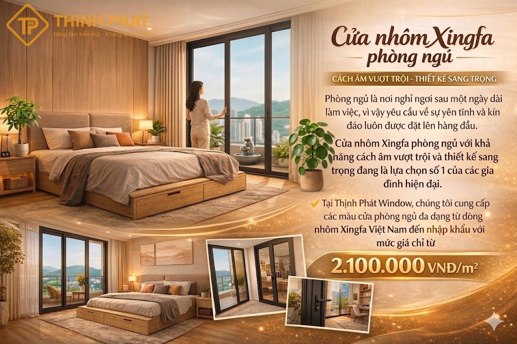 Phòng ngủ là nơi nghỉ ngơi sau một ngày dài làm việc, vì vậy yêu cầu về sự yên tĩnh và kín đáo luôn được đặt lên hàng đầu. Cửa nhôm Xingfa phòng ngủ với khả năng cách âm vượt trội và thiết kế sang trọng đang là lựa chọn số 1 của các gia đình hiện đại. Tại Thịnh Phát Window, chúng tôi cung cấp các mẫu cửa phòng ngủ đa dạng từ dòng nhôm Xingfa Việt Nam đến nhập khẩu với mức giá chỉ từ 2.100.000 VNĐ/m².